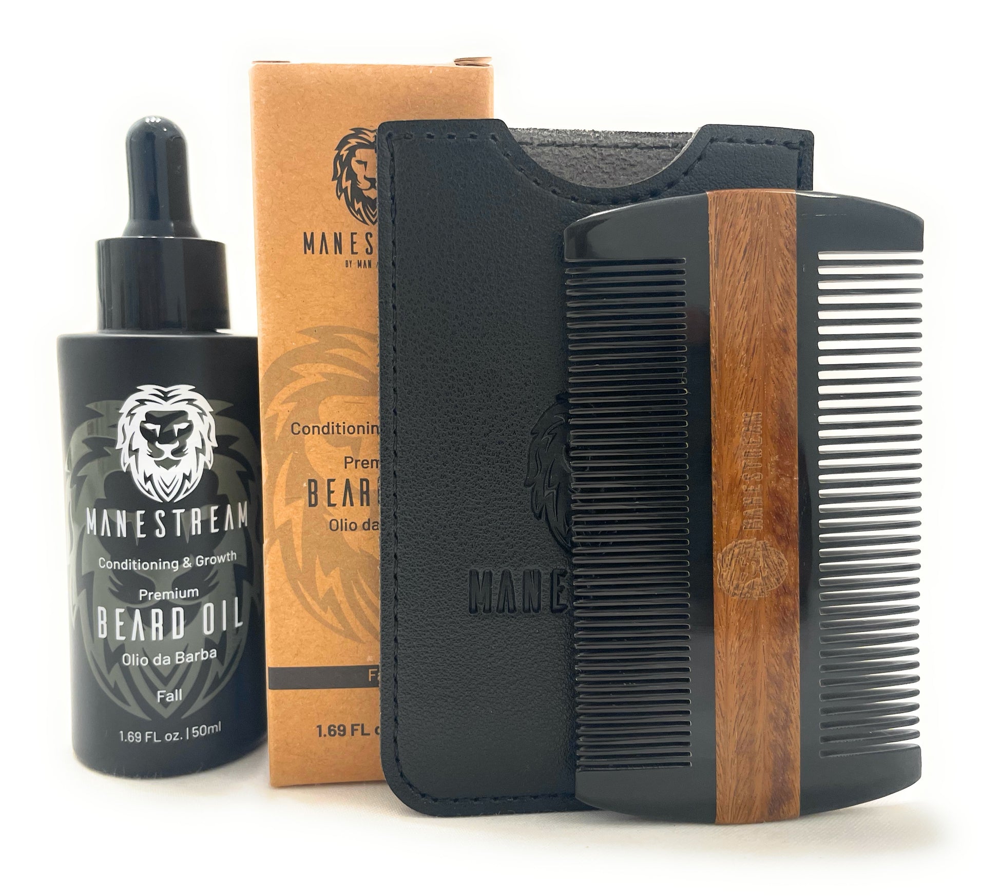 Oxhorn & Sandalwood Dual-Action Beard Comb with Black PU Case and Beard Oil (Fall) Bundle